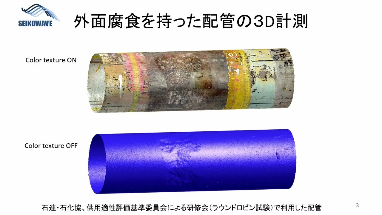その後、当該部分がどの程度減肉しているのかを調べるため、セイコーウェーブより販売している3Dスキャナー及び解析ソフトウェアで、測定・解析をしていく様子をご覧いただけます。 CUI検査のスクリーニングと減肉部の解析 -
